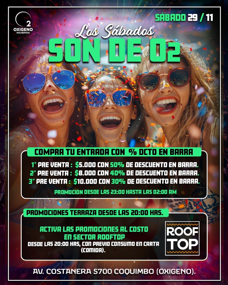 LOS SÁBADOS SON DE O2🪩💃CON 50% A 30% DESCUENTO EN BARRA DE TRAGOS🥃🍸🍹 +21 AÑOS ⚠️NOS RESERVAMOS EL DERECHO DE ADMISIÓN⚠️