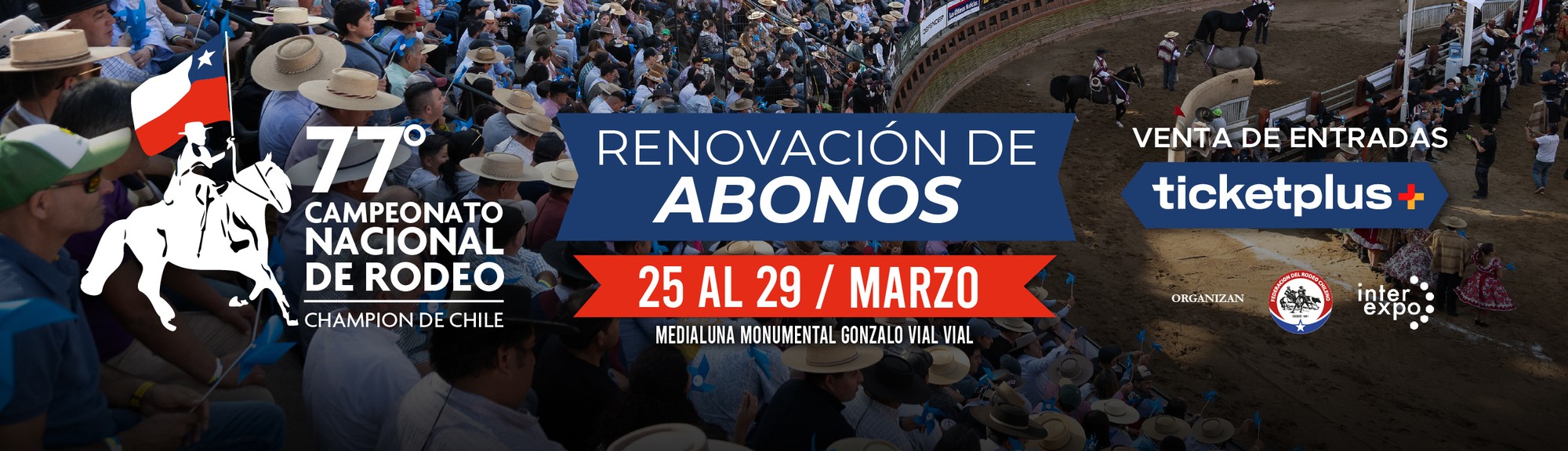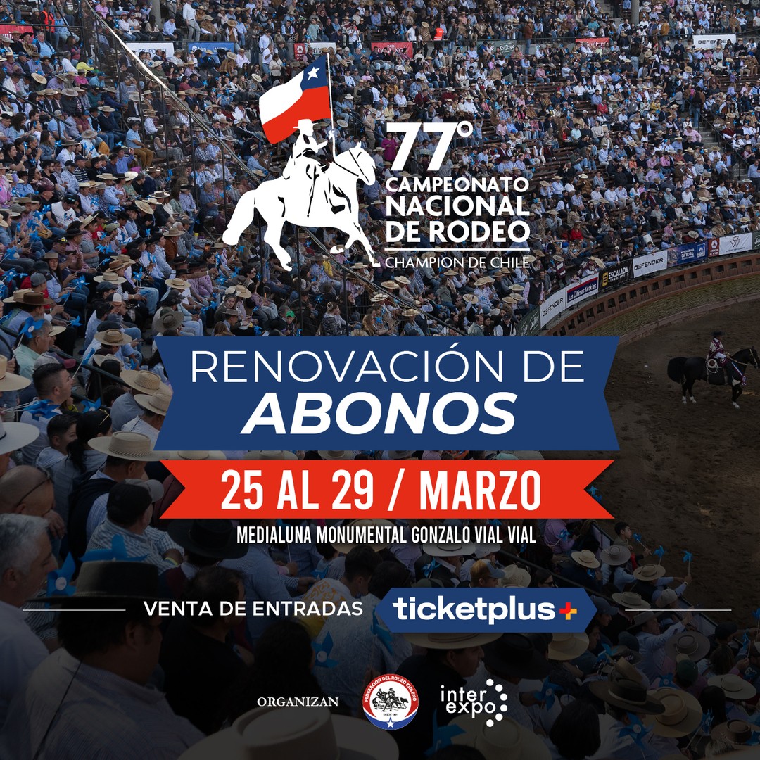 Toda la tradición del campo chileno en la 77º versión del Campeonato Nacional de Rodeo que se efectuará en la Medialuna Monumental de Rancagua los días 25, 26, 27, 28 y 29 de Marzo de 2026. Con colleras participantes desde Arica a Magallanes, el Campeonato Nacional de Rodeo congrega a toda la familia en torno al deporte nacional. Música, artesanía y toda la gastronomía criolla se congregarán en la mayor fiesta huasa del país.