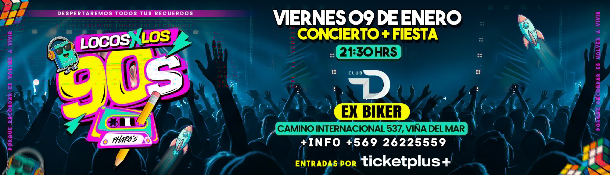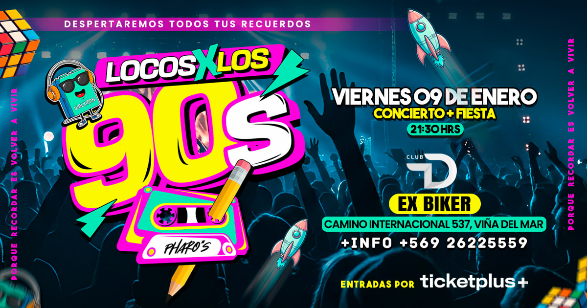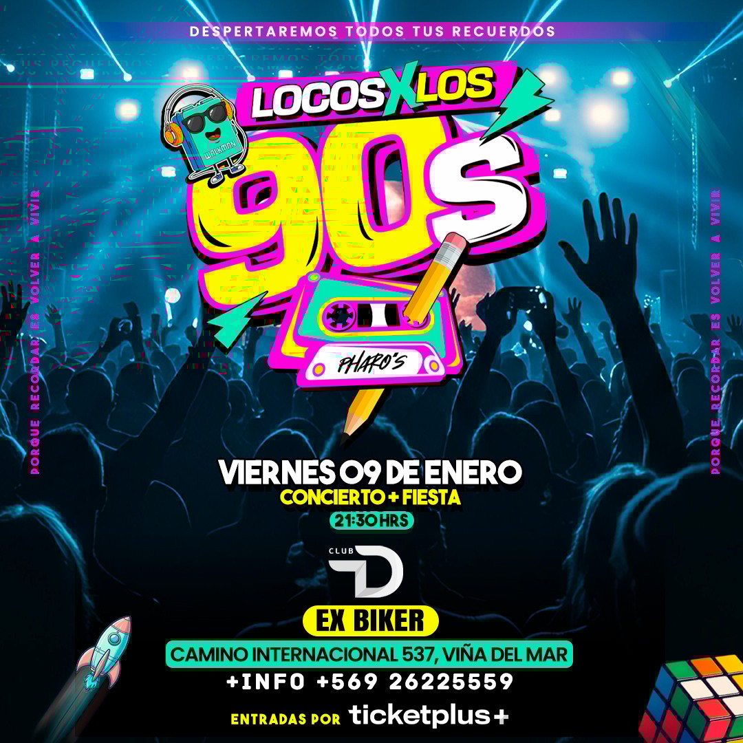 🌟 Llega a chile LOCOS X LOS 90s 🌍 en una Noche épica y mágica llena de energía, hits inolvidables 🎧 que te harán gritar a todo pulmón, con todo el estilo y el poder de los 90s, súbete a la máquina del tiempo❗️Despertaremos todos tus recuerdos en una FIESTA + CONCIERTO con artistas de los 90s 💥PORQUE RECORDAR... ES VOLVER A VIVIR❤️