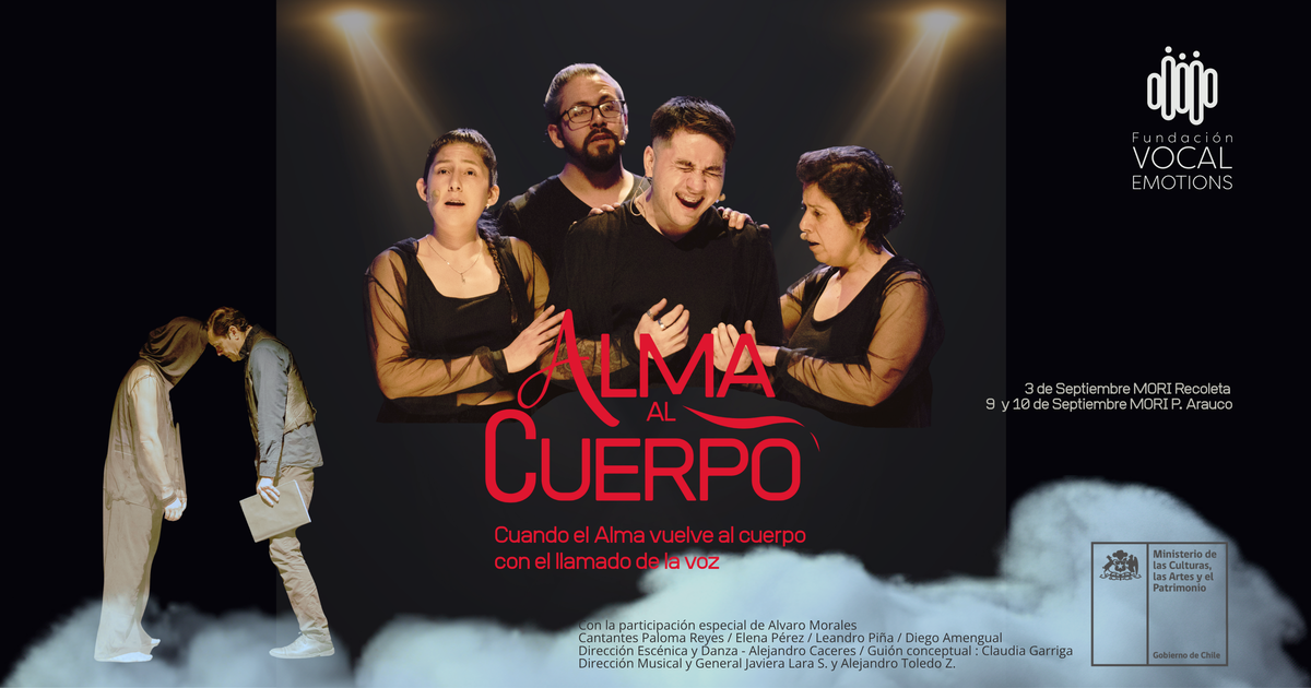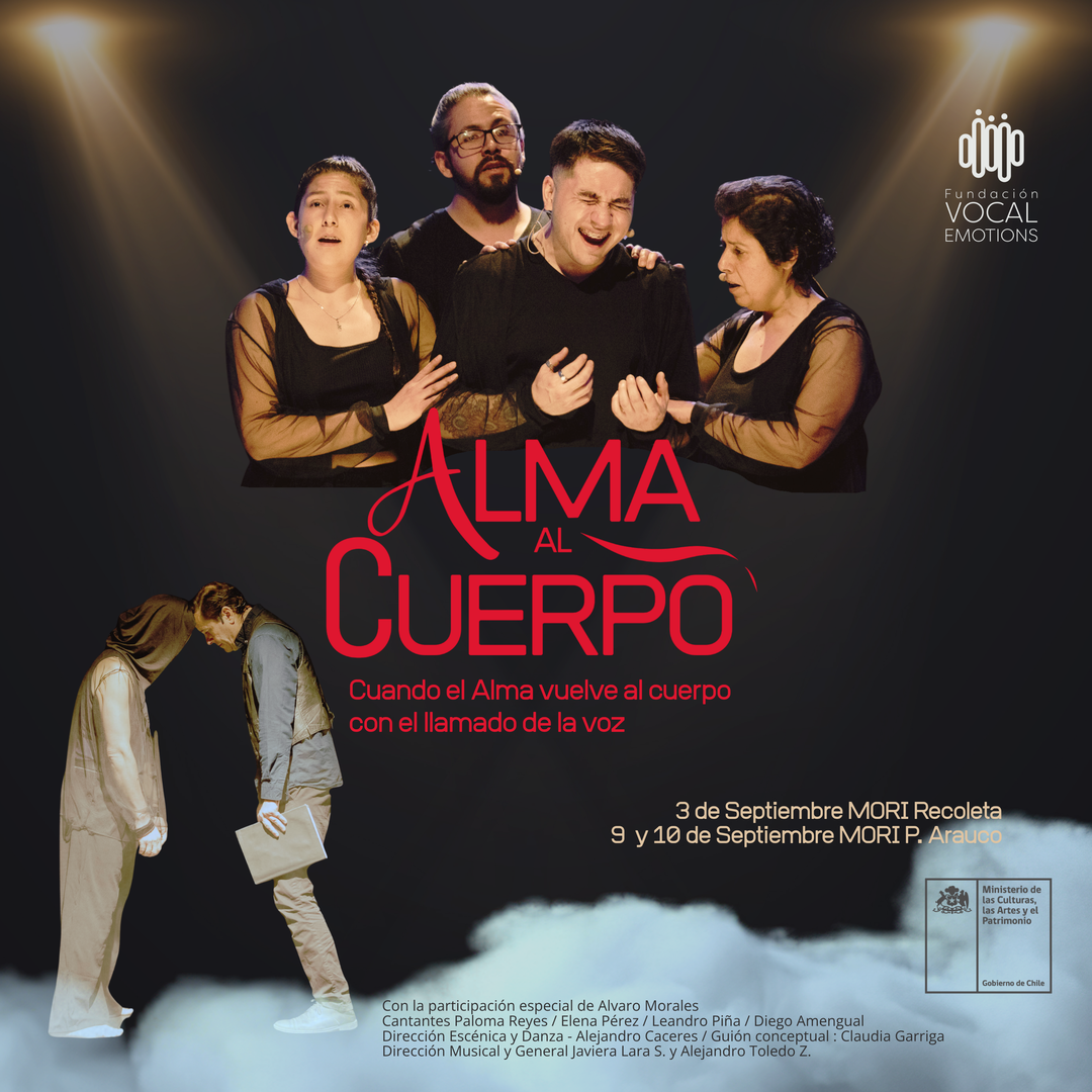 Guiada por el reconocido actor Álvaro Morales como narrador y el bailarín Alejandro Cáceres como intérprete corporal, junto a las voces de Paloma Reyes, Leandro Piña, Elena Pérez y Diego Amengual, “Alma al Cuerpo” presenta versiones corales de artistas como Los Jaivas, Tiro de Gracia, Natalia Lafourcade y Queen.