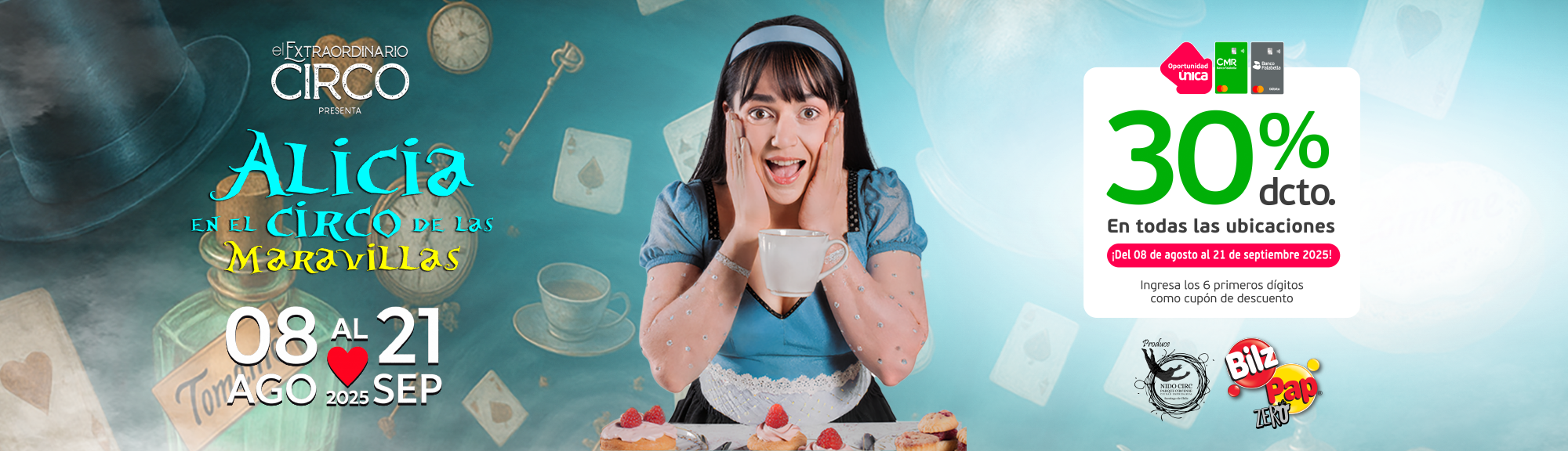 Inspirado en la obra de Lewis Carroll, combina acrobacias, danza, humor y música en una puesta en escena renovada, con 20 artistas y un equipo creativo de nivel internacional. Personajes icónicos como el Sombrerero, la Reina de Corazones y Alicia —interpretada por Deyna Muñoz— guían un viaje visual y emocional que conecta con públicos de todas las edades. Más que un espectáculo, es una experiencia inmersiva que invita a toda la familia a celebrar la imaginación y las Fiestas Patrias en un espacio donde el arte circense se mezcla con la magia del cuento clásico, transformando cada función en un recuerdo inolvidable.