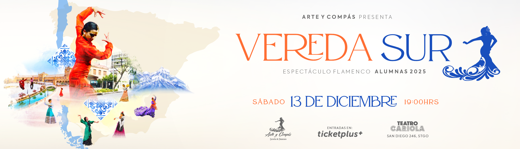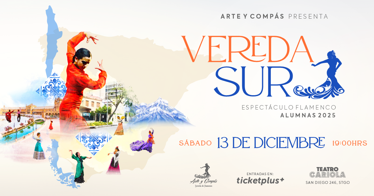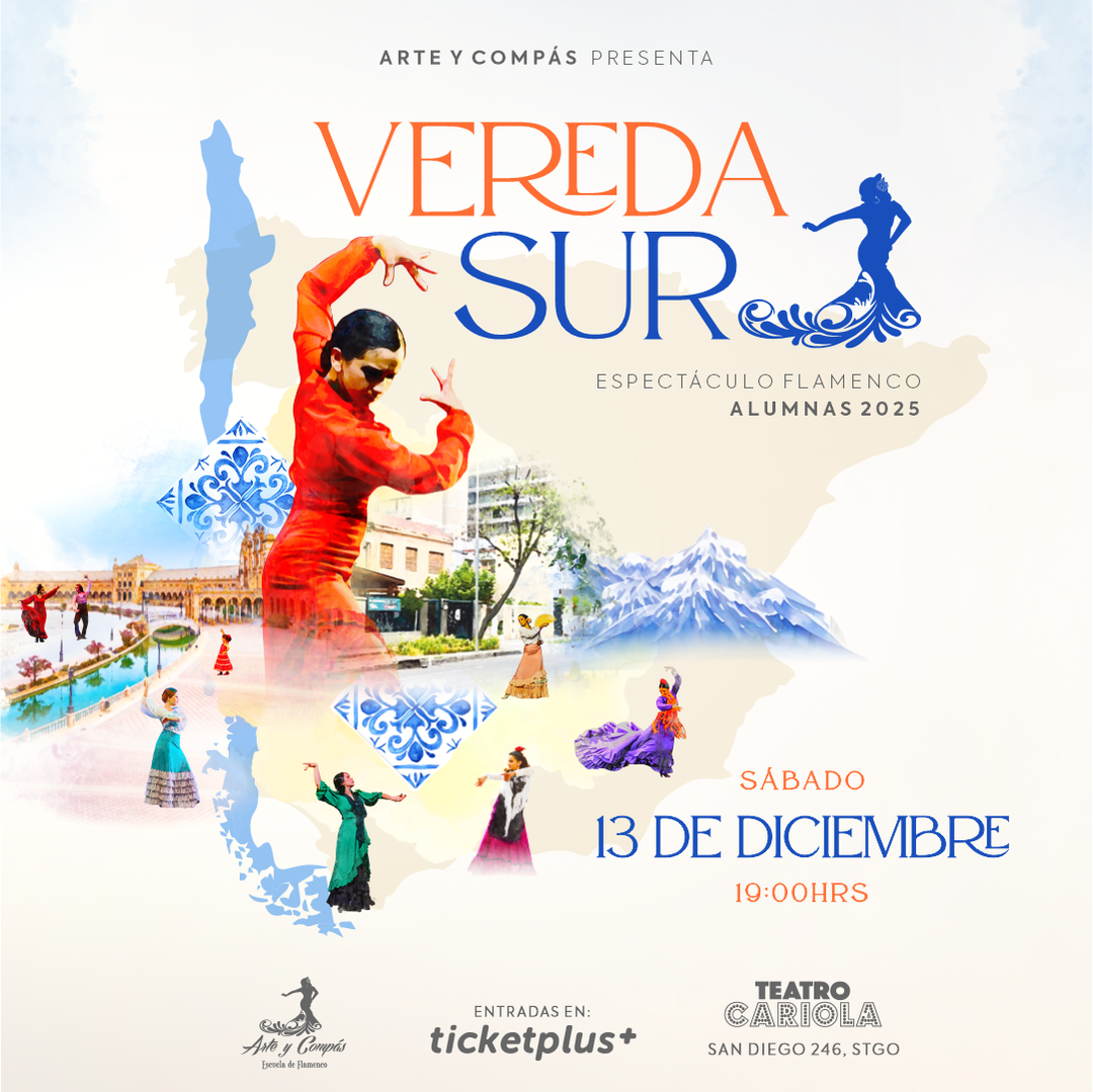 Escuela de flamenco Arte y Compás presenta un nuevo espectáculo de alumnas, donde a través de la música en vivo, la guitarra, el cante, mantones, abanicos y castañuelas, el baile llena el escenario de movimiento, emociones, colores y belleza. En esta ocasión "Vereda Sur" nos invita al viaje por la cultura andaluza, situada al sur de España, y el cómo su legado, tradición y singularidad traspasan hacia nuestra vereda en sudamérica, para vivirla como parte de nosotros mismos.